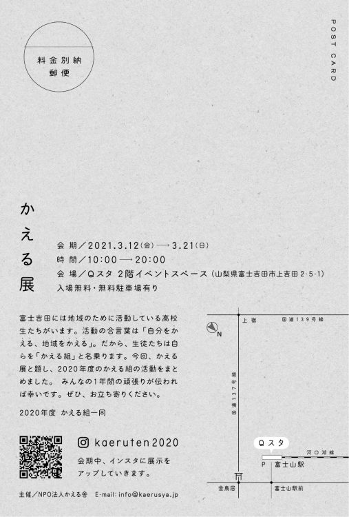 地域の方々に届ける 手作りの活動報告展 かえる展 活動報告会 2020 高校生 【概要】 2021年3月に2020年度の活動報告の展示会「かえる展」を実施しました。取り組んできた活動を13枚のパネルにまとめ、地域の方々に向けて感謝を伝える展示になりました。会期中には500名以上の方にご来場いただきました。ありがとうございました。 【連携】 会場:富士山駅 Q-STA デザイン:若岡伸也 準備:かえる組卒業生一同 DM 表面 DM 裏面 TAGS #富士吉田市 SHARE URL COPY 活動紹介一覧に戻る