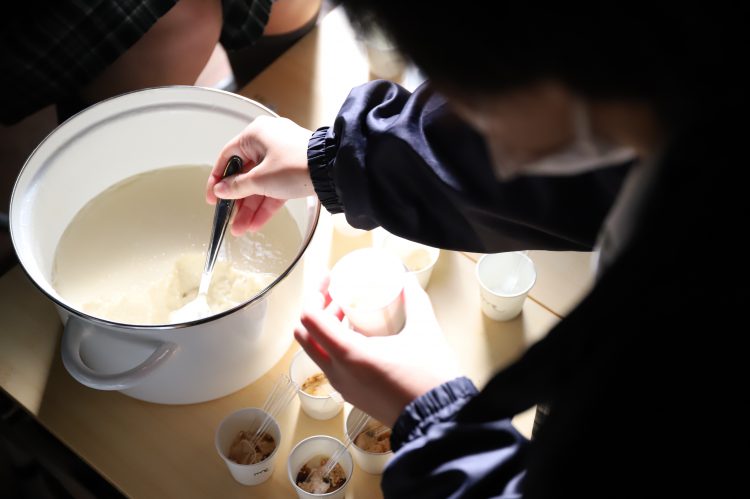 2018年度の活動で誕生した甘酒「レペゼンフジ」。地元のお米と水でできた地域を代表するお土産です(自称)。イベントに出店し、甘酒を使って地域のPRに取り組みました。生徒たちと甘酒を楽しみやすいように台湾風デザートを開発。アドバイスをくれたのは都留のナチュラリズムのお二人。完成したデザートをイベントで200名以上の方に配りながら、地域のお米、水の良さを伝えていきました。美味しいと褒めてくれる言葉が何より嬉しかったそう。