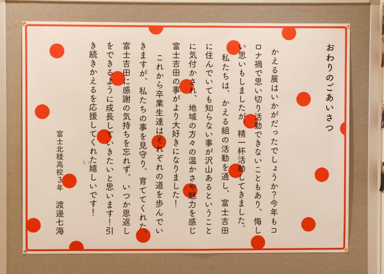 2021年度の活動報告の展示会「かえる展2021」を実施しました。取り組んできた活動を18枚のパネルにまとめ、地域の方々に向けて感謝を伝える展示になりました。会期中には500名以上の方にご来場いただきました。ありがとうございました。